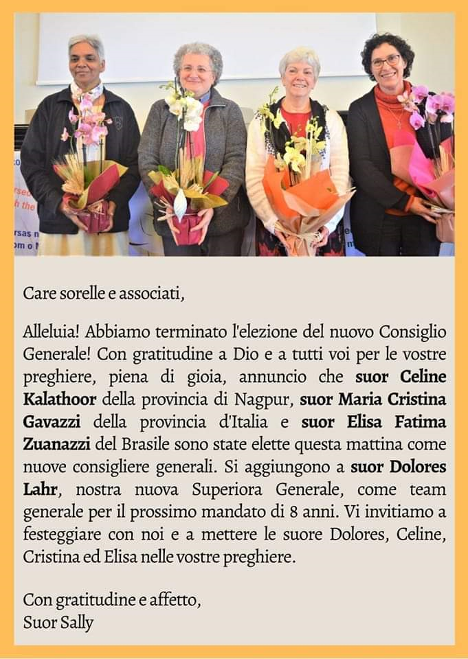 Il 6 dicembre è stata eletta come superiora generale della congregazione delle suore di San Giuseppe di Chambéry, Suor Dolores Lahr della provincia deggli Stati Uniti.