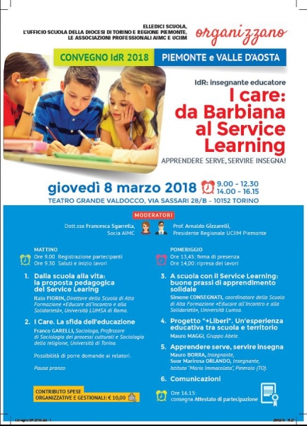 Giovedì 8 marzo 2018 a Torino il Teatro Grande Valdocco ha ospitato l'annuale convegno degli Insegnanti di Religione Cattolica di Piemonte e Valle d'Aosta, sul tema: "I care: da Barbiana al Service Learning. Apprendere serve, servire insegna!". Due nostri docenti (Mauro Borra e suor Marirosa Orlando), in qualità di relatori, hanno presentato le esperienze di Service Learning finora progettate e realizzate nel nostro Istituto (rispettivamente, nella scuola media e nel liceo). Insieme a loro, erano presenti altri due docenti di Religione dell'IMI, Daniela Bertotto (primaria) e Vincenzo Parisi (media). Il convegno - che quest'anno ha visto la presenza di oltre seicento insegnanti di IRC - è organizzato da Editrice Elledici (Elledici Scuola), Ufficio Scuola della Diocesi di Torino e Regione Piemonte, associazioni professionali AIMC e UCIIM.