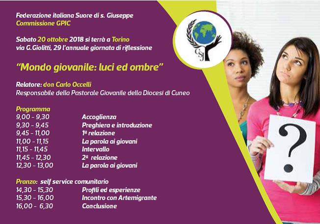 Sabato 20 ottobre 2018a Torino presso l'Istituto Suore di San Giuseppe (via Giolitti, 29) si è svolta l'annuale giornata di riflessione organizzata dalla Federazione Italiana delle Suore di San Giuseppe (commissione Giustizia Pace e Integrità del Creato). Tema di quest'anno: "Mondo giovanile: luci ed ombre". Relatore don Carlo Occelli (responsabile Pastorale Giovanile della Diocesi di Cuneo). Alla giornata ha partecipato anche una rappresentanza dei nostri studenti del liceo delle classi 4-5, i quali hanno presentato i propri progetti di Service Learning (realizzati nell'anno scolastico 2017-2018) sul disagio giovanile e sulla sostenibilità ambientale, accompagnati dai docenti suor Marirosa Orlando (Religione) e Mauro Borra (Filosofia).