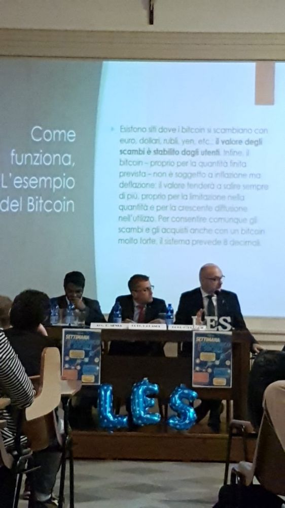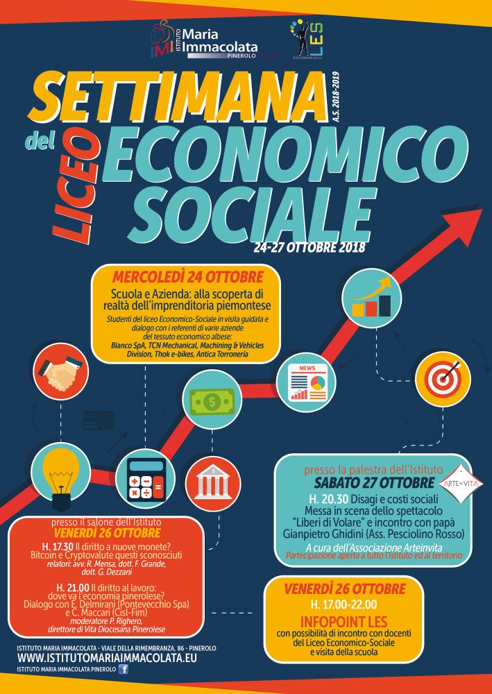 Da mercoledì 24 a sabato 27 ottobre 2018 il nostro Istituto ha ospitato la prima edizione della "Settimana del Liceo Economico-Sociale". Una settimana scandita da numerose e variegate iniziative per promuovere e far conoscere l’indirizzo liceale Economico-Sociale. Iniziata mercoledì 24 ottobre con “Scuola e Azienda: alla scoperta di realtà dell’imprenditoria piemontese”; gli studenti del liceo Economico-Sociale dell’IMI in visita guidata e dialogo con i referenti di alcune aziende del tessuto economico albese. Si è proseguito venerdì 26 ottobre, quando il salone del nostro Istituto ha ospitato ben due incontri. Nel pomeriggio “Il diritto a nuove monete? Bitcoin e Cryptovalute, questi sconosciuti” (relatori Giuseppe Dezzani, Franco Grande e Raju Mensa). In serata “Il diritto al lavoro: dove va l’economia pinerolese? Dialogo con gli imprenditori del territorio”: sono intervenuti Enrico Delmirani (imprenditore, Pontevecchio srl di Luserna San Giovanni) e Cristina Maccari (sindacalista FIM CISL) e ha moderato Patrizio Righero (direttore di “Vita Diocesana Pinerolese”). Sempre venerdì 26 “Infopoint LES”: possibilità di incontro con i docenti del Liceo Economico-Sociale e visita della scuola. Infine, sabato 27 ottobre nella palestra sono andati in scena lo spettacolo “Liberi di volare” (realizzato dai ragazzi del liceo che hanno partecipato ai corsi teatrali dell'associazione culturale "ArteinVita") e l’incontro con papà Gianpietro Ghidini (associazione “Pesciolinorosso”).