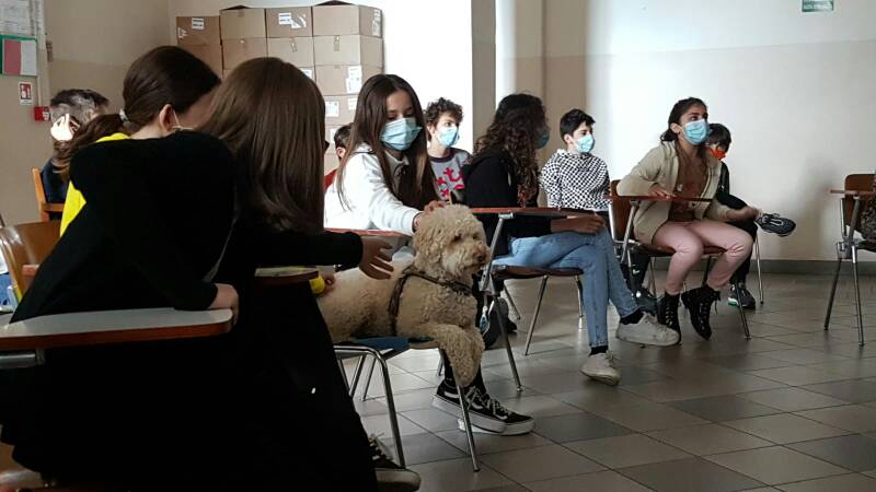 "Sorrisi a 4 Zampe" è un’associazione senza fini di lucro, nata con lo scopo di promuovere e diffondere i benefici della Pet Therapy; professionisti a due ed a quattro zampe hanno fatto riflettere i ragazzi non solo sulle diverse caratteristiche comportamentali dei nostri cani, ma anche sulla loro grande capacità di donare sollievo e sostegno ai soggetti più in difficoltà, agli anziani, alle persone speciali, ai malati, a chiunque abbia voglia di relazionarsi con naturalezza e spontaneità. L’animale, grazie alla sua diversità, diventa un prezioso portatore di caratteristiche introvabili negli uomini, specie nella società contemporanea: non giudica (ai suoi occhi siamo tutti uguali), non si mette in competizione, non rifiuta, accetta di appartenere, dona un senso alla nostra presenza, offre stimoli cognitivi, allontana l’attenzione dai problemi, infine offre possibilità comunicative che si possono scoprire solo attraverso il rispetto reciproco e l’osservazione. Biscotto, Camilla, Bum, Chili e Sally con le loro scodinzolate hanno portato spensieratezza in questo secondo anno scolastico "di pandemia"; con qualche leccatina ci hanno fatto capire che tutti abbiamo bisogno di essere amati ed ognuno di noi può imparare ad apprezzare ed accogliere il prossimo attraverso la conoscenza reciproca.