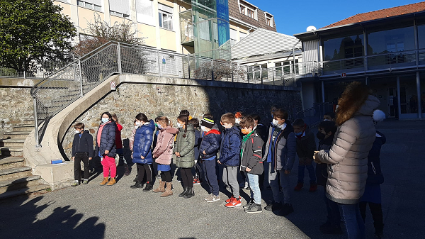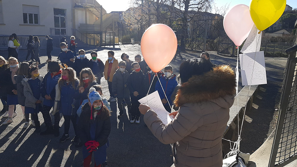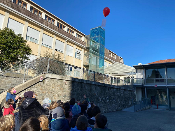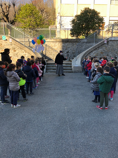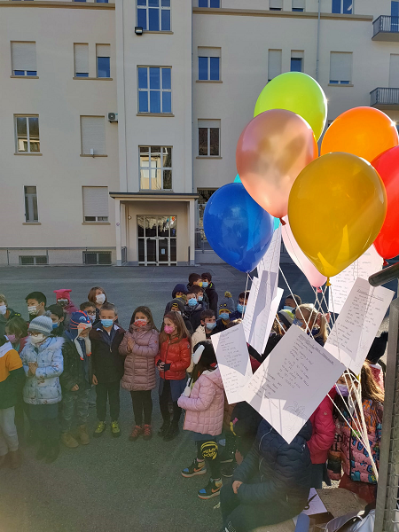 Ogni classe in cortile ha meditato con le parole delle preghiere scritte dai ragazzi di quinta e poi simbolicamente le hanno fatte volare in alto.